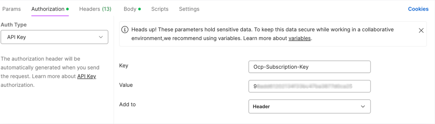 Kirimkan email kepada tim API IBID untuk permintaan Subscription Key. Sebelum Anda memulai, pastikan Anda telah melakukan masuk ke akun Anda untuk mempelajari dokumen dan mengunduh demo API di sini. Untuk memudahkan implementasi, harap diperhatikan bahwa jika Anda menggunakan API, pastikan untuk menyertakan Subscription Key sebagai Header "Ocp-Subscription-Key" seperti gambar menggunakan Postman di bawah ini.